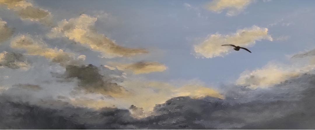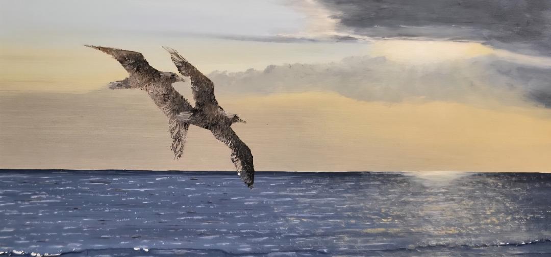 The movement of the birds against the dramatic sky highlights the beauty of companionship in nature, reflected in their gentle flight across the evening sea.